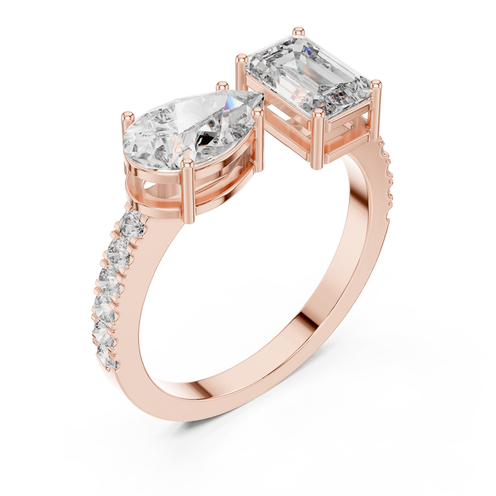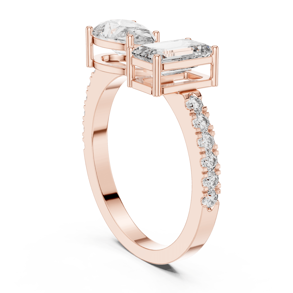 The Bound Forever Ring from the Evermore Collection celebrates the art of togetherness. A pear and an emerald-cut diamond meet in elegant balance — two unique shapes united in luminous harmony. Symbolic and timeless, it embodies a love that transcends individuality yet honors it. A radiant promise of forever.