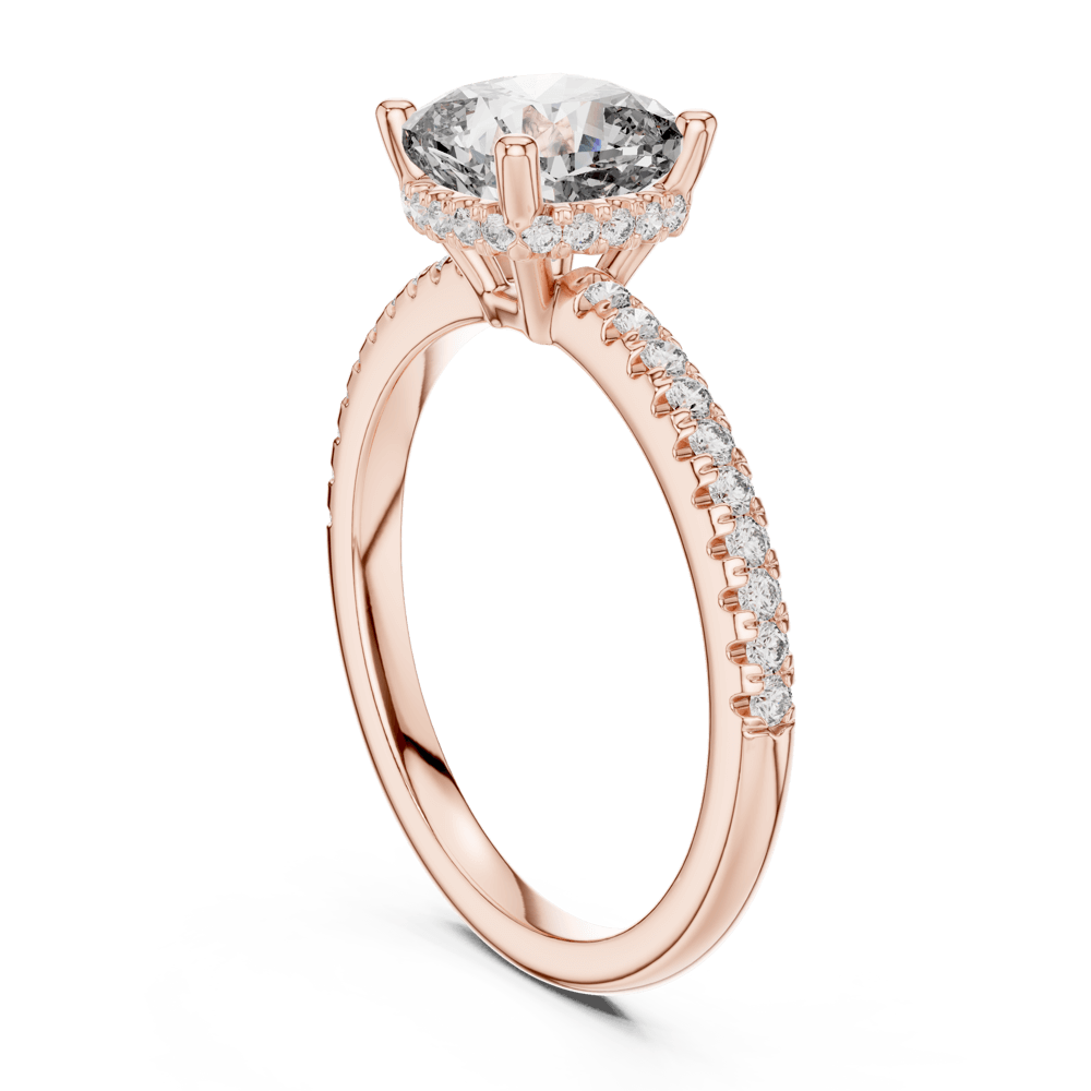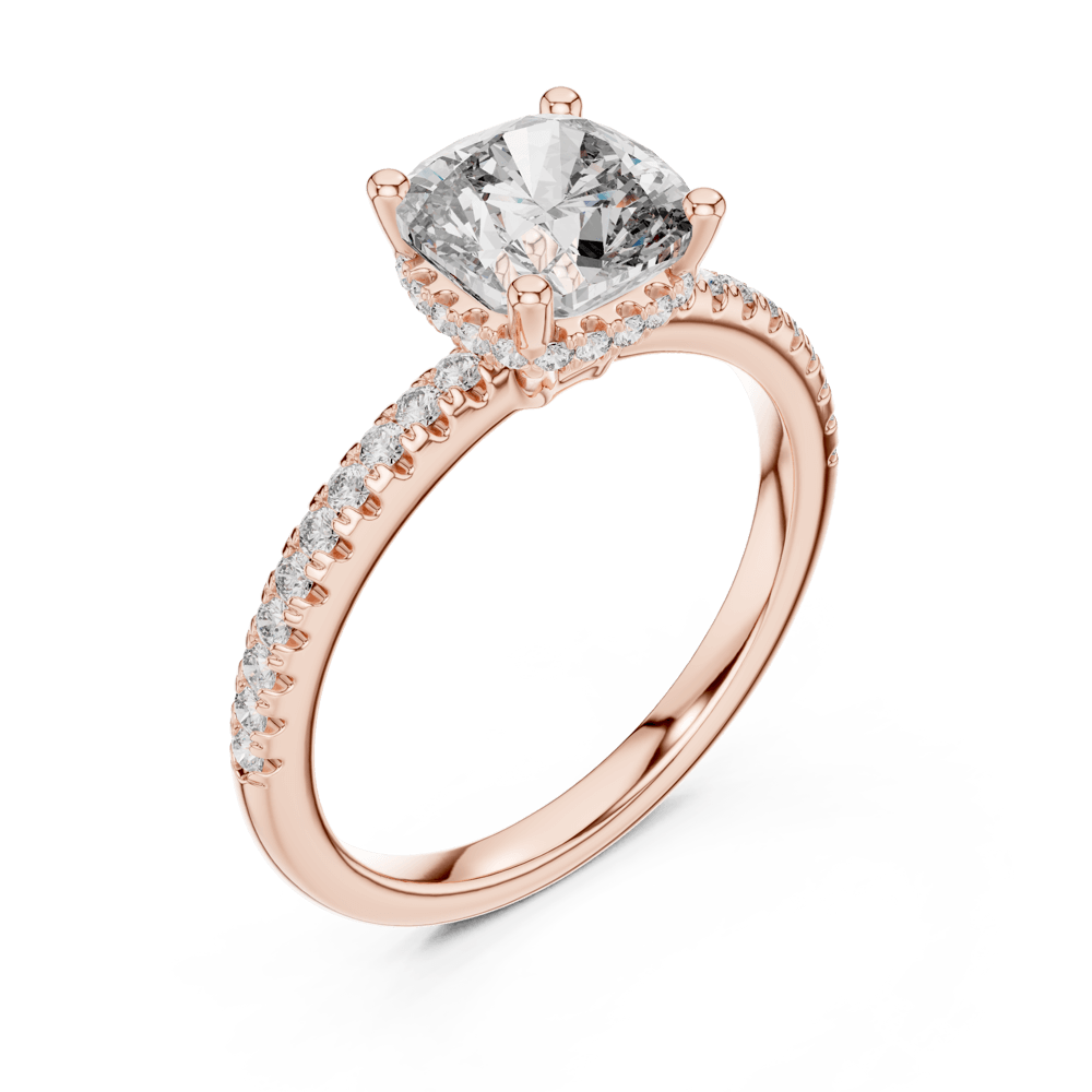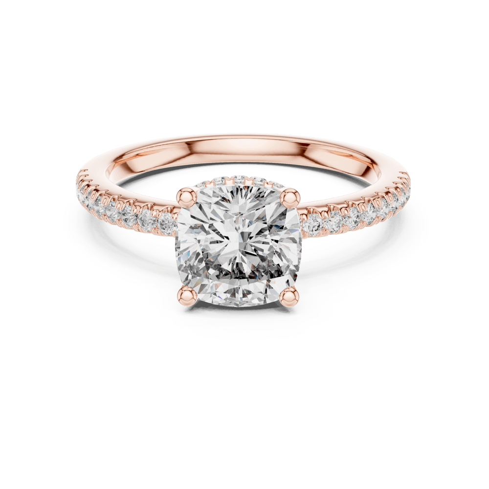 The Cushion Pave Elegance Ring captures the essence of everlasting love with its refined solitaire design, elevated by a shimmering pave band. The brilliant center stone is gracefully framed by rows of delicate diamonds along the shank, creating a luminous display from every angle. A symbol of timeless devotion, this ring is crafted for those who believe in love that shines evermore.