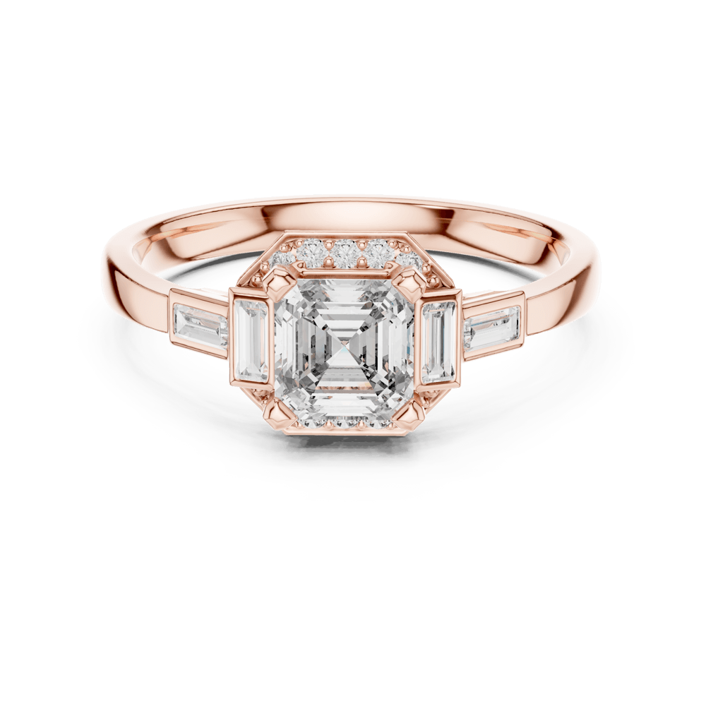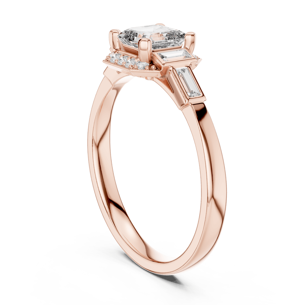 Inspired by the glamour of Art Deco design, the Deco Luxe Ring features a radiant step-cut centerpiece framed with baguette and round diamond accents. The architectural symmetry and vintage allure combine to create a ring that is as striking as it is timeless. A true statement of elegance, it belongs to the Eminence Collection — crafted for those who carry sophistication with confidence.