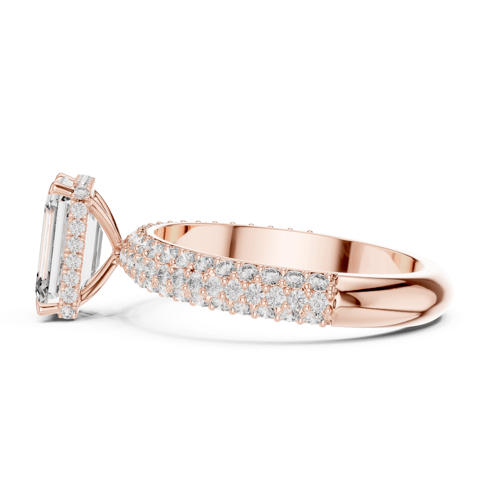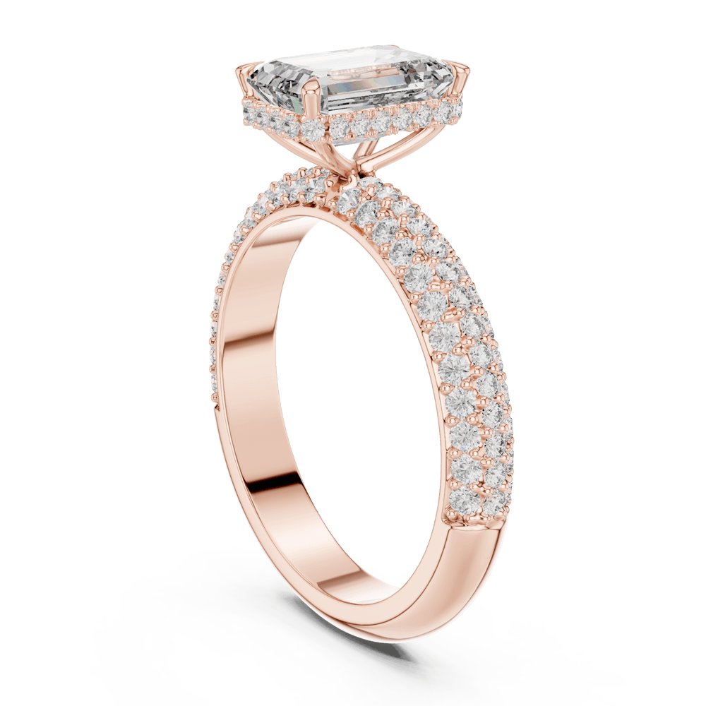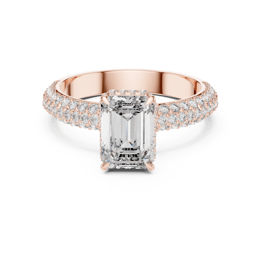 The Evertrue Ring is a radiant promise of everlasting love, designed with an elegant emerald-cut centerpiece surrounded by pavé diamonds that shimmer from every angle. Its graceful design reflects loyalty, devotion, and beauty that endures through time. As part of the Evermore Collection, this ring is crafted to symbolize timeless romance — a jewel that speaks of love meant to last forever.