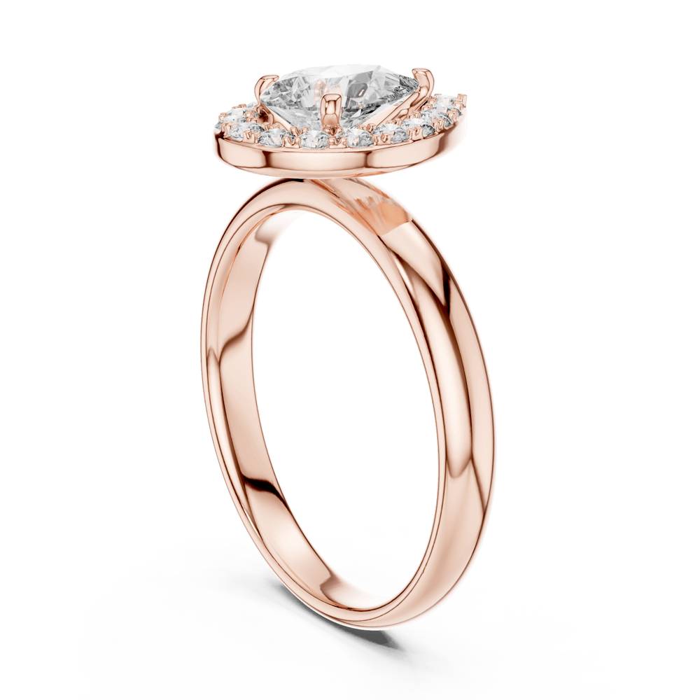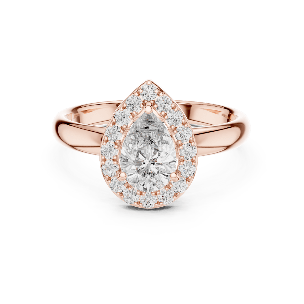 A dazzling symbol of love and elegance, this design features a captivating teardrop-shaped center stone surrounded by a halo of sparkling diamonds. The elongated silhouette of the pear cut enhances brilliance while creating a graceful, modern look. Set on a sleek band, this ring beautifully balances bold presence with timeless sophistication, making it the perfect choice for brides who want to shine at every angle.