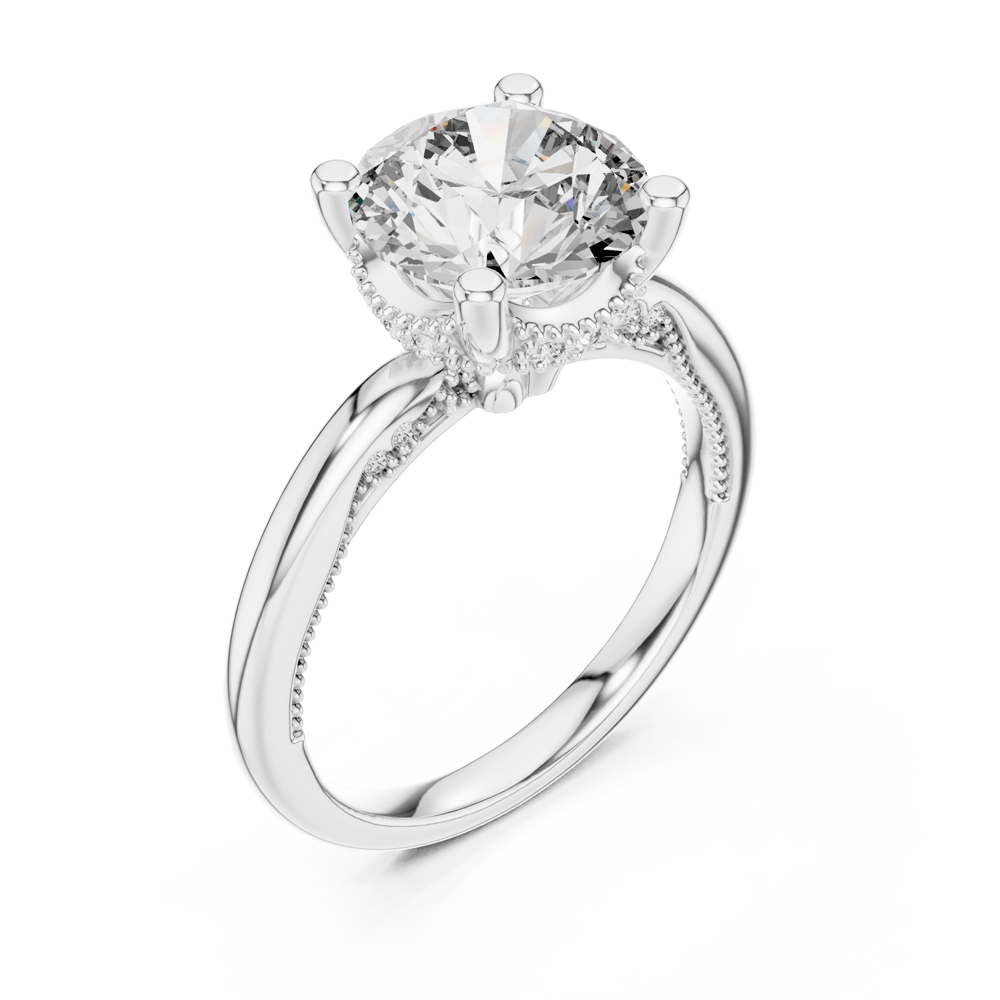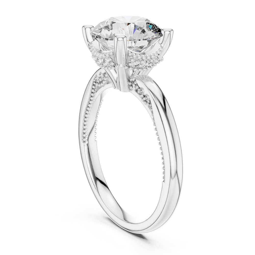 A masterpiece of grace and grandeur, the Valencienne Ring showcases a cathedral setting that elevates the center diamond with timeless elegance. Beneath the crown lies a hidden halo, a secret shimmer that reveals itself with every movement. Crafted to embody sophistication and allure, this design blends classic artistry with a modern touch, making it an heirloom-worthy treasure.